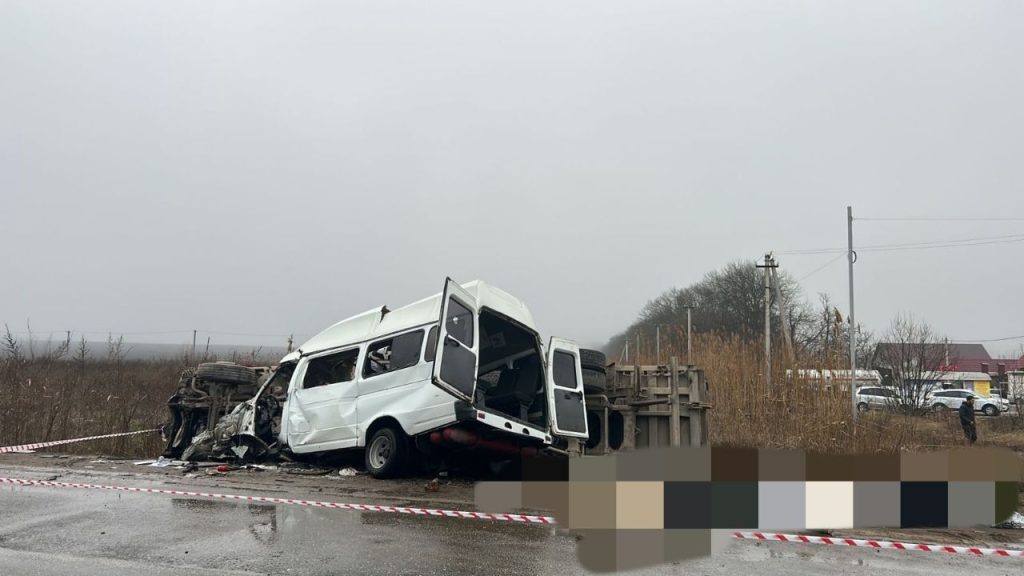Авария случилась в районе Пятигорска в Предгорном муниципальном округе. После столкновения грузовика с маршрутным такси семь человек погибли, ещё четверо пострадали. Удар был сильным, перевернулся даже грузовой КАМАЗ.