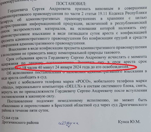 26 января 2024 года судья Дрогичинского районного суда Юлия Михайловна Кукса вынесла постановление о 15 сутках ареста для Сергея Гордиевича. А протокол на него был составлен сотрудником Дрогичинского РОВД старшим лейтенантом Сергеем Александровичем Яковлевым. За репост 11.11.2023 года ссылки с сайта «Ганцавіцкі час». Материалы этого сайта были признаны экстремистскими 3 ноября.