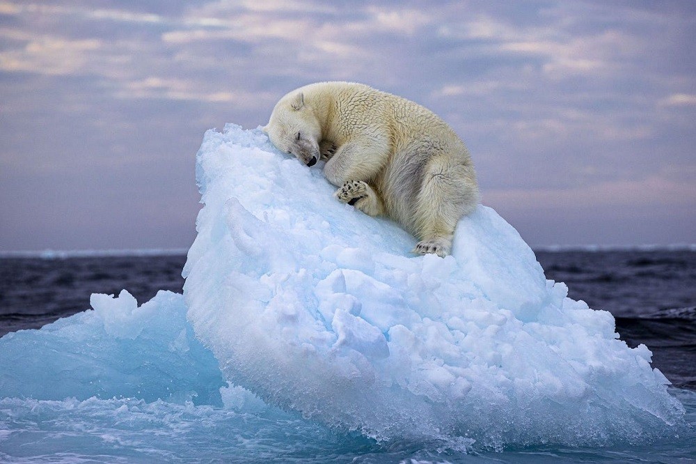 Фотограф-любитель Нима Сарихани сделала этот снимок во время трехдневной экспедиции у норвежского архипелага Шпицберген. После трех дней поисков экипаж заметил двух белых медведей — молодого и более взрослого самца. Незадолго до полуночи, когда корабль остановился рядом с медведями, младший забрался на небольшой айсберг и выкопал лапами углубление, в котором и уснул.