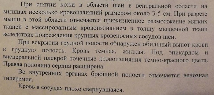 Сделали вскрытие. Специалист констатировал, что собачка была удушена в горизонтальном положении с фиксированием задних лап и шеи. То есть, растягивали её верёвками в стороны. На шее были ссадины от удавления. Во время вскрытия делалась фототаблица, где всё зафиксировано.