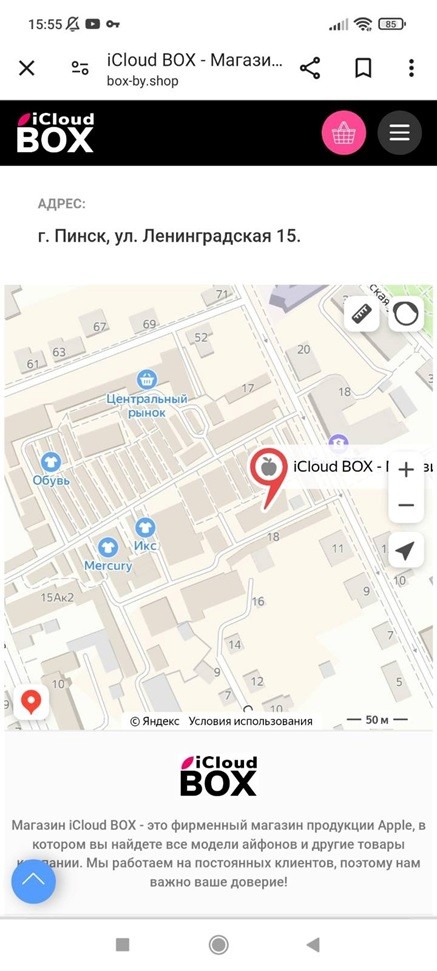 Сверив карту на их сайте и карту Яндекса, сомнений не осталось, что это фотошоп. На картинку просто вставили флажок с названием магазина. Впрочем, фото некоего здания с вывеской «iCloud BOX», также оказалось фейковым. Жители Пинска не смогли вспомнить, где ж такой магазин. Некоторые присылали внешне схожие фото, но это явно было не то здание, и никаких вывесок с названием «iCloud BOX» не было.