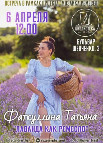 В субботу, 6 апреля, в 12.00 в рамках проекта «Мозаика ремёсел» в Брестской центральной городской библиотеке им. А. С. Пушкина (б-р Шевченко, 3) состоится встреча на тему «Лаванда как ремесло». Свой бренд «Lavandoviy_Shmel» представит Татьяна Фаткуллина.