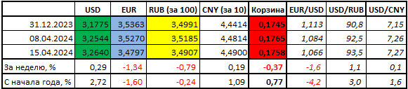 Что касается белорусского рубля, то он укрепился к евро и российской валюте, уступив доллару и юаню. Стоит отметить, что доллар и юань на торгах в Беларуси 11 апреля 2024 года обновили максимумы с начала года. Ранее это сделал и евро, но к концу нынешней недели обвалился. А вот снижение российской валюты в составе корзины «перевесило» рост доллара и юаня.