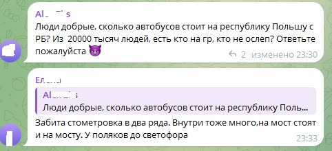Путешественница на автобусе Инна сообщила, что преодоление границы только от шлагбаума заняло почти 7 часов: «Едем шоп-туром, попали за шлагбаум на белорусскую в 02.00, за шлагбаум польской в 06.00, выехали с польской границы только что, в 8.45».