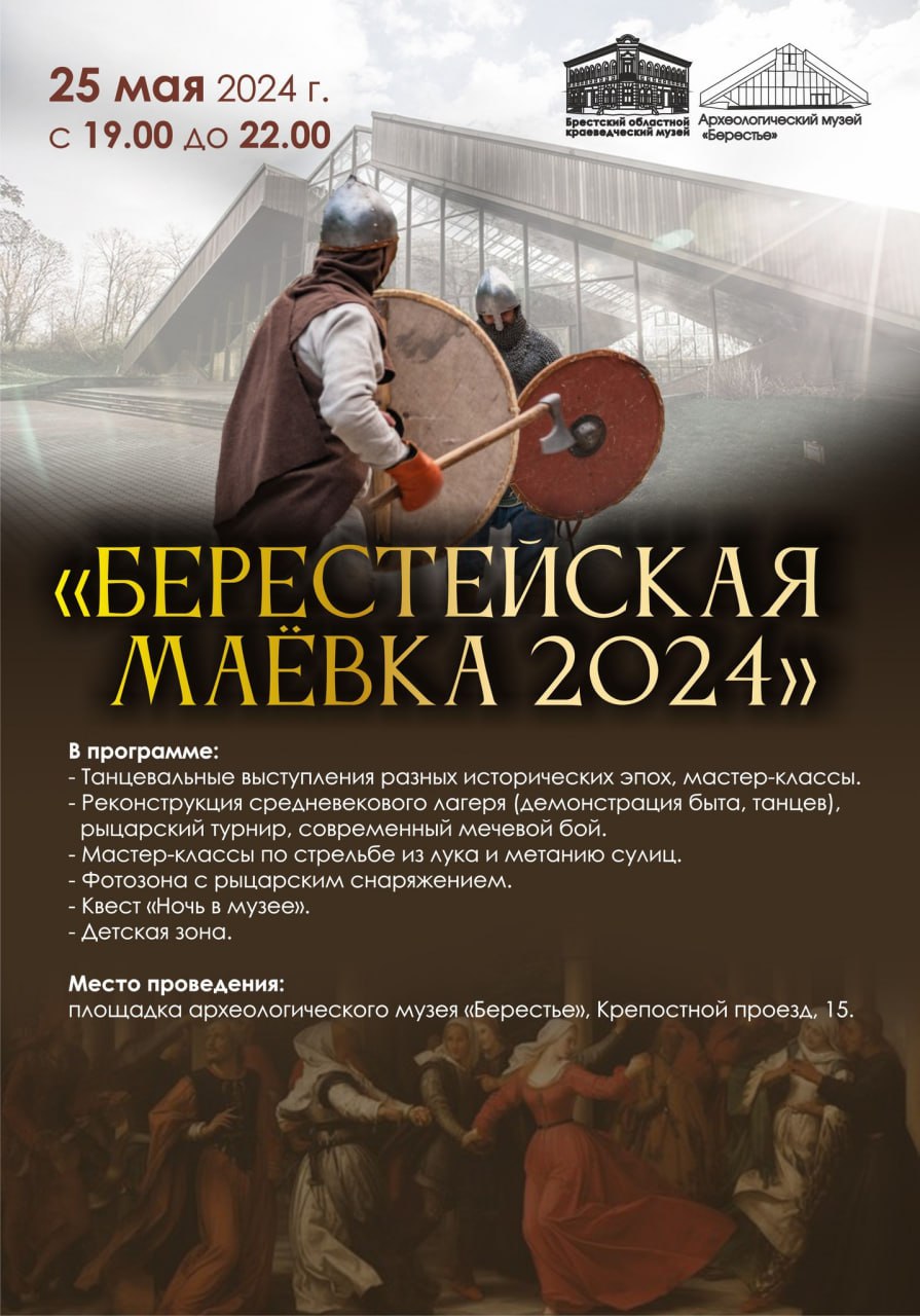 Маёвка пройдет 25 мая 2024 года в 19.00 в археологическом музее «Берестье». Это учреждение является филиалом областного краеведческого музея и расположено рядом с Брестской крепостью.