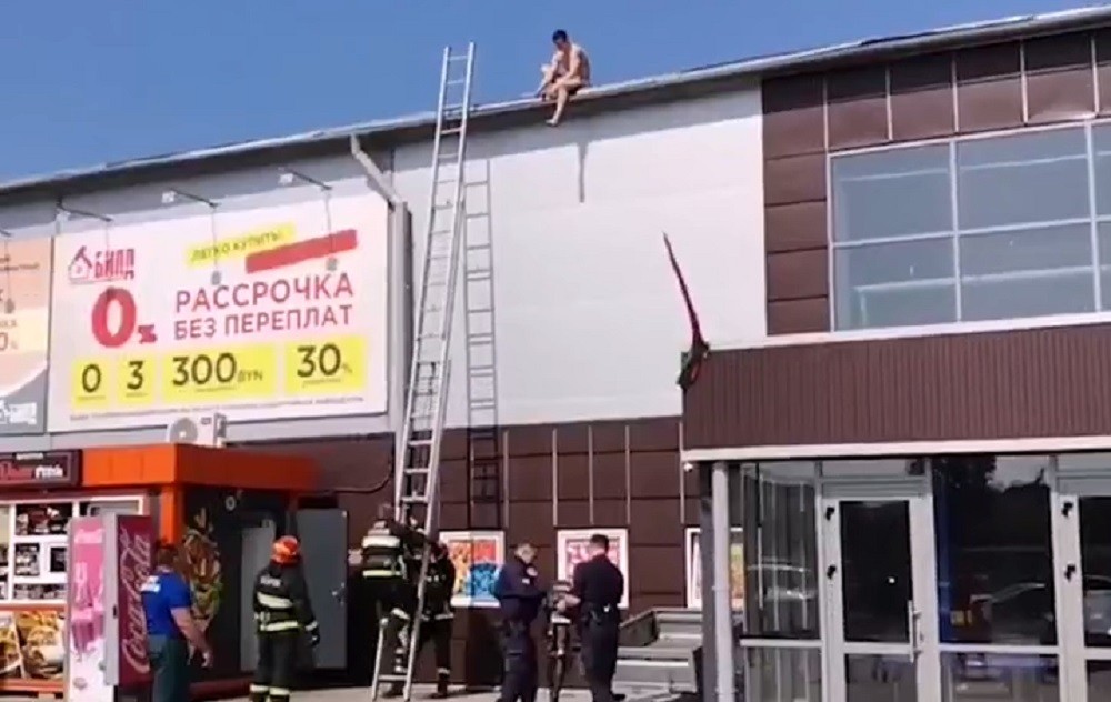 Мужчину с крыши строительного магазина снимали в Барановичах около 11 утра. Люди заметили голого «Карлсона» и вызвали экстренные службы.