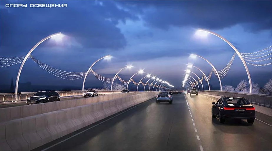 Проезжая часть станет четырехполосной. Также значительно (до четырех метров) расширятся тротуары, предназначенные для пешеходного и велосипедного движения. На мосту поставят дугообразные фонари: они будут определять современный облик сооружения. Сама конструкция получит декоративную подсветку, которая будет менять цвет.