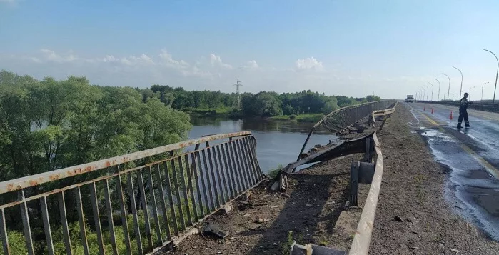 Грузовой автомобиль Вольво с полуприцепом-цистерной пробил дорожное ограждение и упал с моста через реку Днепр. Цистерна из 4 секций была заправлена топливом объёмом почти 25 тонн.