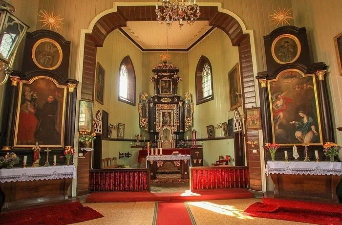 Во-вторых, уникальным внутренним строением и убранством: зал перекрыт балочным потолком, хоры поддерживаются шестью столбами, а в резном алтаре, обрамленном коринфскими колонами, имеется семь икон XVIII-XIX веков. Там же в алтарной части можно заметить две чугунные мемориальные доски, датированные 1829 и 1836 гг., посвященные Радзвиллам.