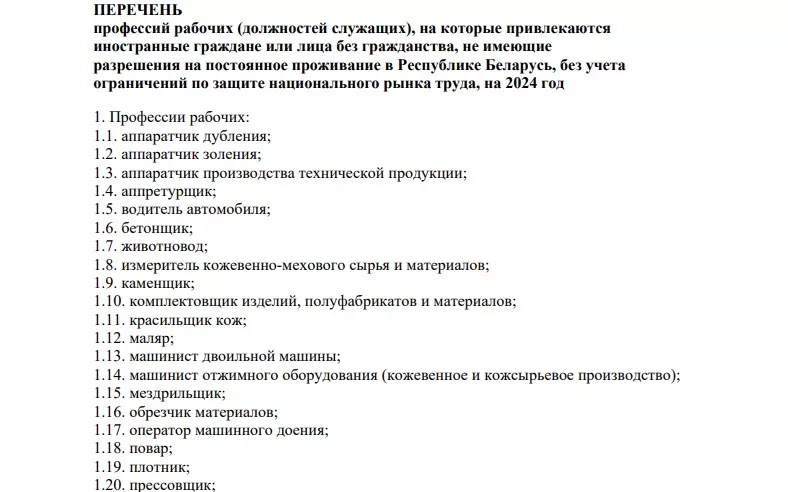 Новый перечень профессий, доступных для иностранцев, утвережден постановлением №50 Министерства труда и социальной защиты Беларуси. Оно вступит в силу с 1 августа 2024 года.