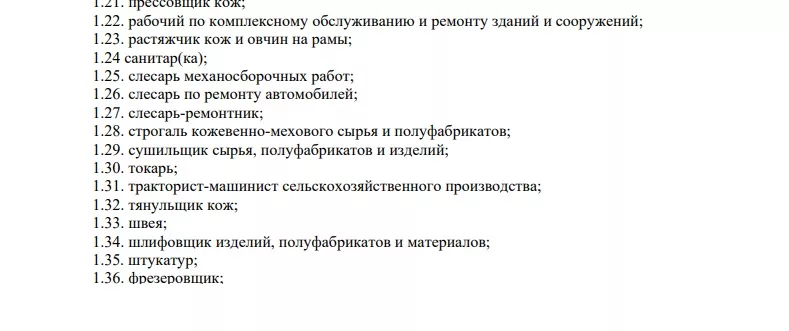 Многие новые специальности в перечне связанные с кожевенным производством. Так, в нем присутствуют машинист отжимного оборудования, обрезчик материалов, прессовщик кож, тянульщик кож.