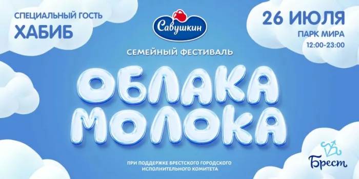 В брестском Парке Мира в пятницу, 26 июля, пройдёт фестиваль «Облака молока», который устраивает «Савушкин продукт». Он станет праздничным подарком от компании к Дню города для всех его жителей и гостей. Программу можно посмотреть здесь.