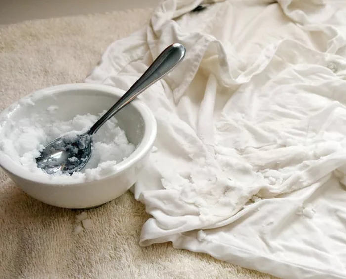 Белые вещи тоже часто страдают от дезодоранта. В этом случае можно использовать смесь из моющего средства для посуды, пищевой соды и перекиси водорода.