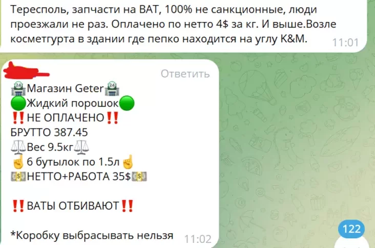 За провоз шести упаковок жидкого стирального порошка общим весом 9,5 килограмма дают $35. Автомобильные запчасти передают по ставкам $4-5 за килограмм. Корм для животных переправляют по $3,5-4 за килограмм. Также продолжают передавать автомобильные колеса, которые челноки должны перевозить под видом запаски.