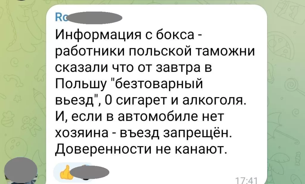 «Информация из бокса – работники польской таможни сказали, что от завтра в Польшу «бестоварный въезд»: ноль сигарет и алкоголя. И если в автомобиле нет хозяина – въезд запрещён. Доверенности не канают», — написал в приграничном чате Роман.
