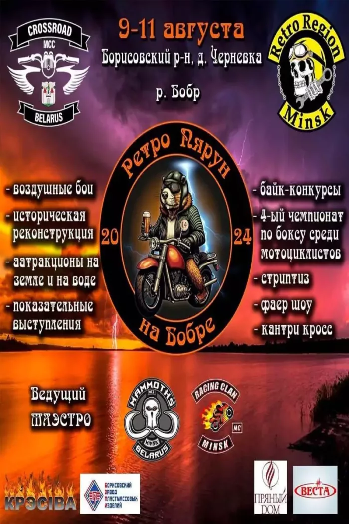 И еще одна мотоафиша: 9–11 августа в Борисовском районе на реке Бобр состоится «Ретро Пярун»: