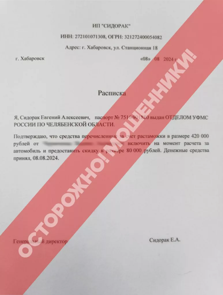 Чтобы вызвать доверие у покупателей, мошенники направляют им расписку о получении денежных средств. Также выдается поддельный таможенный ордер с подтверждением стоимости растаможки. В качестве бонуса — скидка на покупку авто.
