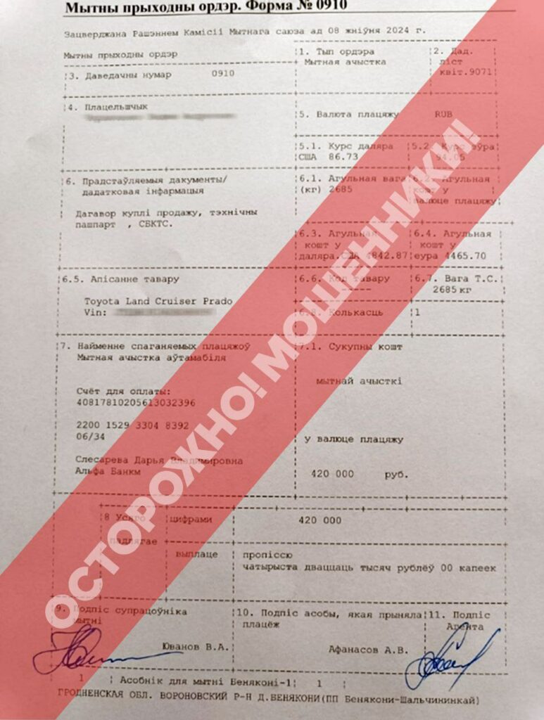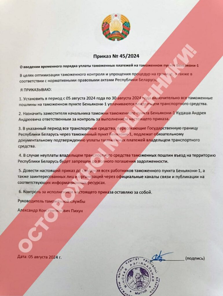 В фальшивке обозначена обязанность по уплате пошлин при ввозе транспортных средств. «Приказ» якобы касается таможенного пункта «Бенякони-1» в период с 5 по 30 августа 2024 года.
