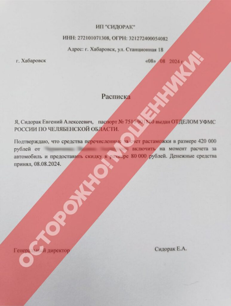 Чтобы вызвать доверие у покупателей, мошенники направляют им расписку о получении денежных средств. Также выдается поддельный таможенный ордер с подтверждением стоимости растаможки. В качестве бонуса — скидка на покупку авто.