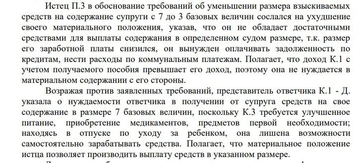 Суд обязал Павла платить алименты на сына в размере 25% дохода. На содержание супруги он должен был перечислять 7 базовых величин в месяц. На момент судебного решения это было 254 рубля, сейчас — 280. Деньги надо платить пока ребенку не исполнится 3 года и жена не выйдет из декретного отпуска.