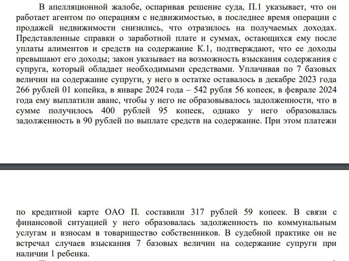 Павел остался недоволен таким решением. Он подал апелляцию, приложил побольше справок, которые доказывают, что его доход ниже, чем у супруги. Мужчина требовал снизить выплаты на ее содержание до 3 базовых. Брестчанин даже подчеркнул, что «в судебной практике он не встречал случаев взыскания 7 базовых величин на содержание супруги при наличии одного [общего] ребенка».