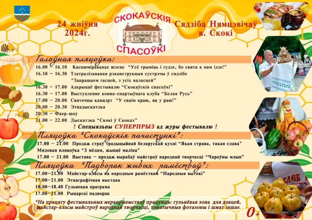 И всё же главной особенностью фестиваля является кулинарная программа. В нынешнем году она включает четыре конкурса, в том числе на лучшую кирмашовую лавку и самое оригинальное блюдо из яблок и мёда. Также будет конкурс традиционного хлеба «Скокаўскі смак» и конкурс мёда «Народное признание».