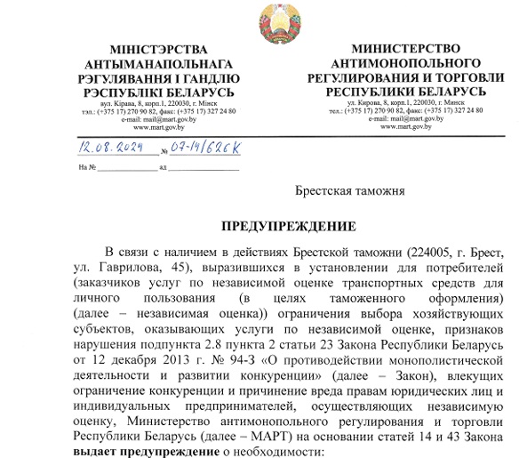 За подписью главы МАРТ Алексея Богданова в середине августа 2024 года Брестской таможне вынесено предупреждение. В тексте документа сказано: до 23 августа таможня должна письменно информировать декларантов, что они могут предоставить заключения и отчеты от любой организации из государственного реестра оценщиков. Это касается тех, кто получил запросы и требования в феврале-марте 2023 года.