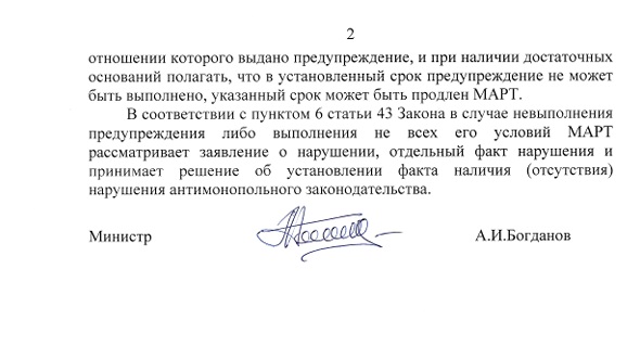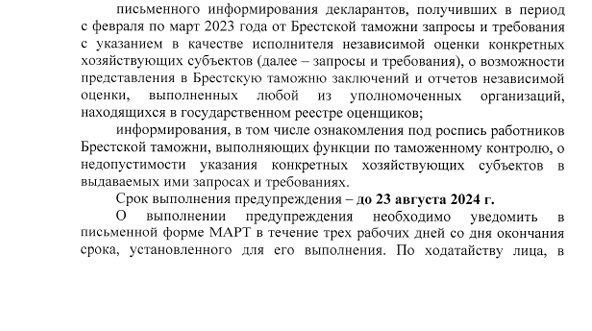 Кроме того, работники Брестской таможни должны быть ознакомлены под подпись о недопустимости указания конкретных субъектов хозяйствования в выдаваемых требованиях. Если в установленный срок предупреждение не будет выполнено, МАРТ обещает его может продлить.