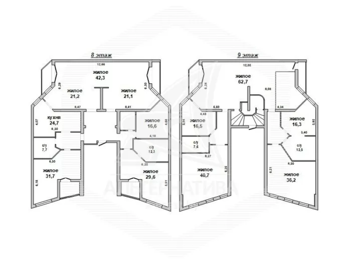 Общая площадь 475,5 кв.м, жилая 334,9 кв.м. Улучшенная планировка отличается симметричностью и обилием внутреннего пространства, сохранена удобная геометрия комнат, учтено естественное освещение и все тонкости инженерных коммуникаций. Гостиные, общие и спальные комнаты размещены на разных уровнях, две симметричные кухни 24,7 кв.м. и 24,7 кв.м, четыре совмещенных санузла. Четыре лоджии и два балкона застеклены.
