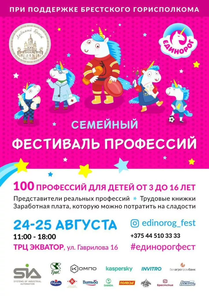 Семейный фестиваль профессий «Единорог» состоится 24-25 августа 2024 года в Бресте. Местом проведения избрана площадка у торгово-развлекательного центра «Экватор» (улица Гаврилова, 16). Город профессий можно посетить с 11:00 до 18:00.