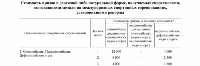 Согласно документу, за золото спортсмен получит 12 тысяч базовых величин, пишет BAR24. Сегодня это 480 тысяч. За серебро – 6 тысяч базовых – 240 тысяч. Бронзовой медали у нас пока нет, но за нее платят 4 тысячи базовых – 160 тысяч рублей.
