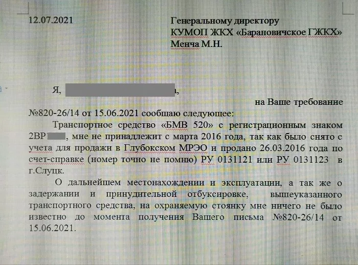 «История длится уже с 2016 года. Но узнала я об этом в 2021 году. Я в 2016 сняла с учёта БМВ и продала по счёт-справке в другую область. Счет-справка у меня, к сожалению, не сохранилась. Потом оказалось, что покупатель не поставил ее на учёт, то ли перепродал, то ли сам не успел оформить, его посадили в тюрьму, а авто забрали на штраф стоянку. Сейчас мне присылает ЖКХ письма о том, что я должна забрать авто и заплатить за стоянку огромную сумму. Первый раз прислали такое письмо в 2021 году. Сумму выставили что-то около 1000$. Правомерно ли то, что я могу забрать проданную машину? Как мне отказаться от нее? Какие мои дальнейшие действия? Прилагаю последнее письмо ЖКХ и мой ответ на первое письмо», — поделилась женщина.