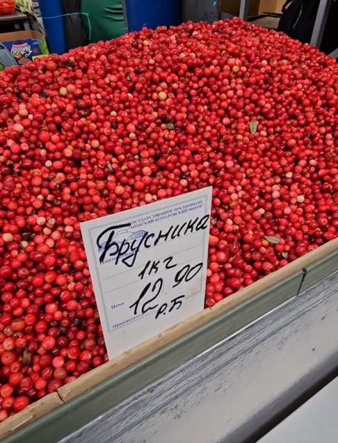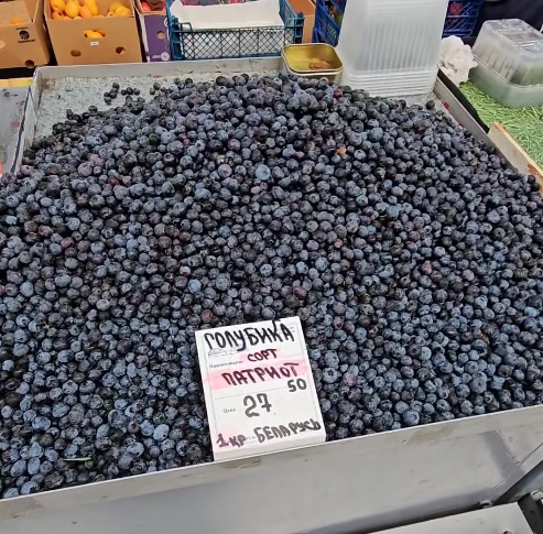 Конечно, большой выбор фруктов, ягод. Молдавский чернослив 4,9. Есть сливы и по 8. Турецкие нектарины 5,9-6,5-6,9. Есть нектарины и по 8,9. Абрикосы тоже с большой разбежкой цен от 8,9 до 25 рублей за кило. Голубика садовая подорожала – разбежка цен 22-25-27,5 рубля за килограмм. Клюква 10,9. Брусника 12,9. Груши по 3,9. Есть груша сорта «алматинка» из Бреста по 5 рублей. Яблоки 2,5-3,6-3,9. Замечена на «Комаровке» и клубника – продают по 25 рублей за кило.