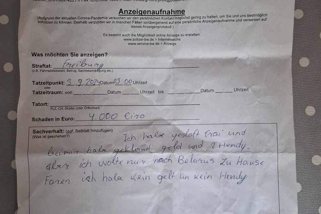 Больше двух недель прошло, что мне удалось узнать за это время. 3 сентября мой брат обращался за помощью в местную полицию Фрайбурга. На автовокзале он встретился с человеком, с которым я уже связалась. И тот человек решил ему помочь, но он сам был проездом. Они пошли в полицию. В итоге этот парень мне скинул фотографию заявления. В нём брат указал, что его обокрали. И он не может добраться домой. В итоге в полиции сказали, что ничем помочь не могут.