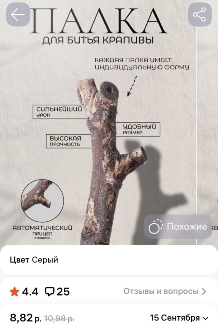 Продавец описывает, что палка для битья крапивы имеет высокую прочность, удобный размер и наносит сильнейший урон. И, исходя из описания, каждая имеет индивидуальную форму, так что у покупателя этого товара будет единственный экземпляр.