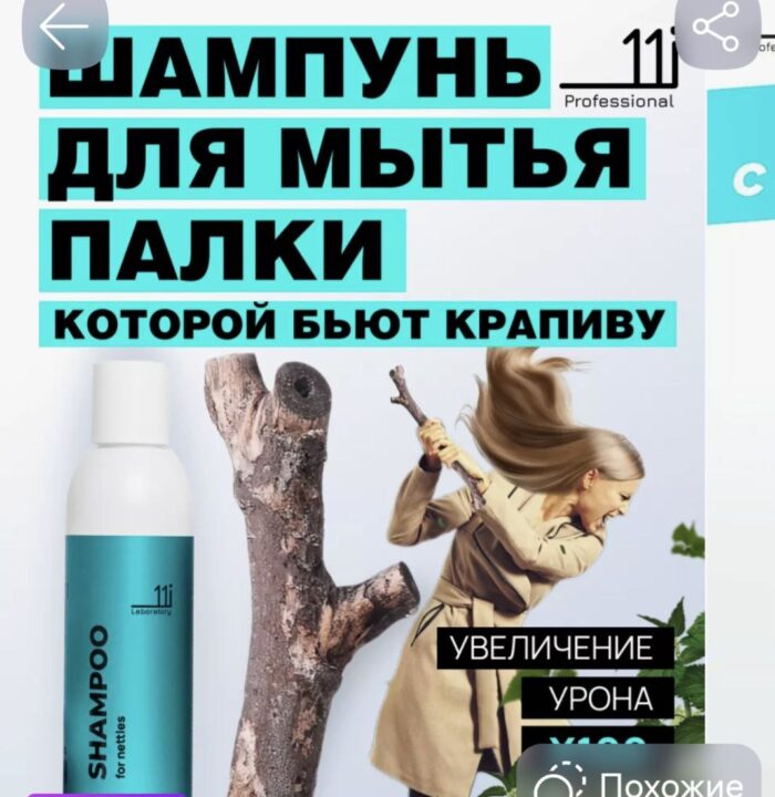 На этом тема с палкой для битья крапивы не закончилась. Многие подхватили идею и стали приписывать к своим товарам название вышеуказанного. Первым в списке идёт шампунь для палки. Правда, в характеристиках указано, что он женский. Но каким образом её можно применить к палке для битья крапивы – не указано. Единственное, как можно связать эти два товара – шампунь выполняет функцию очищения. Стоимость – 23,26 рубля. И, судя по комментариям, специально для деревянного изделия её никто не покупал, поэтому оценить качество пока невозможно.