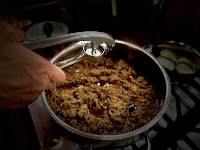 Перетираем жареные грибы и овощи на мясорубке и отправляем тушиться на 20 минут после закипания. Добавляем соль, томатную пасту, перец и чеснок.