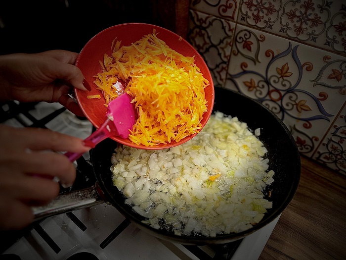 Лук мелко режем и обжариваем на масле 5-7 минут, добавляем тертую морковь и жарим еще 5-7 минут.