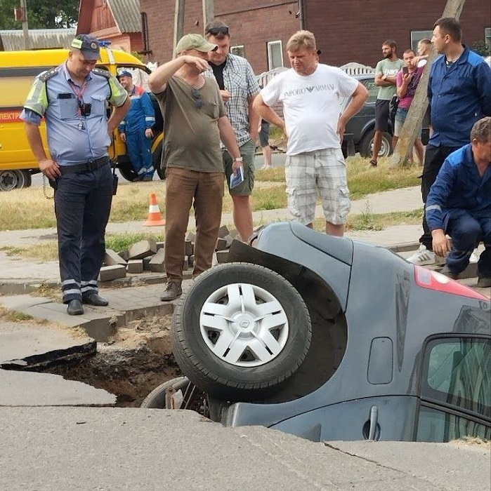 Автомобиль провалился под землю в Бобруйске. Фото из местных чатов