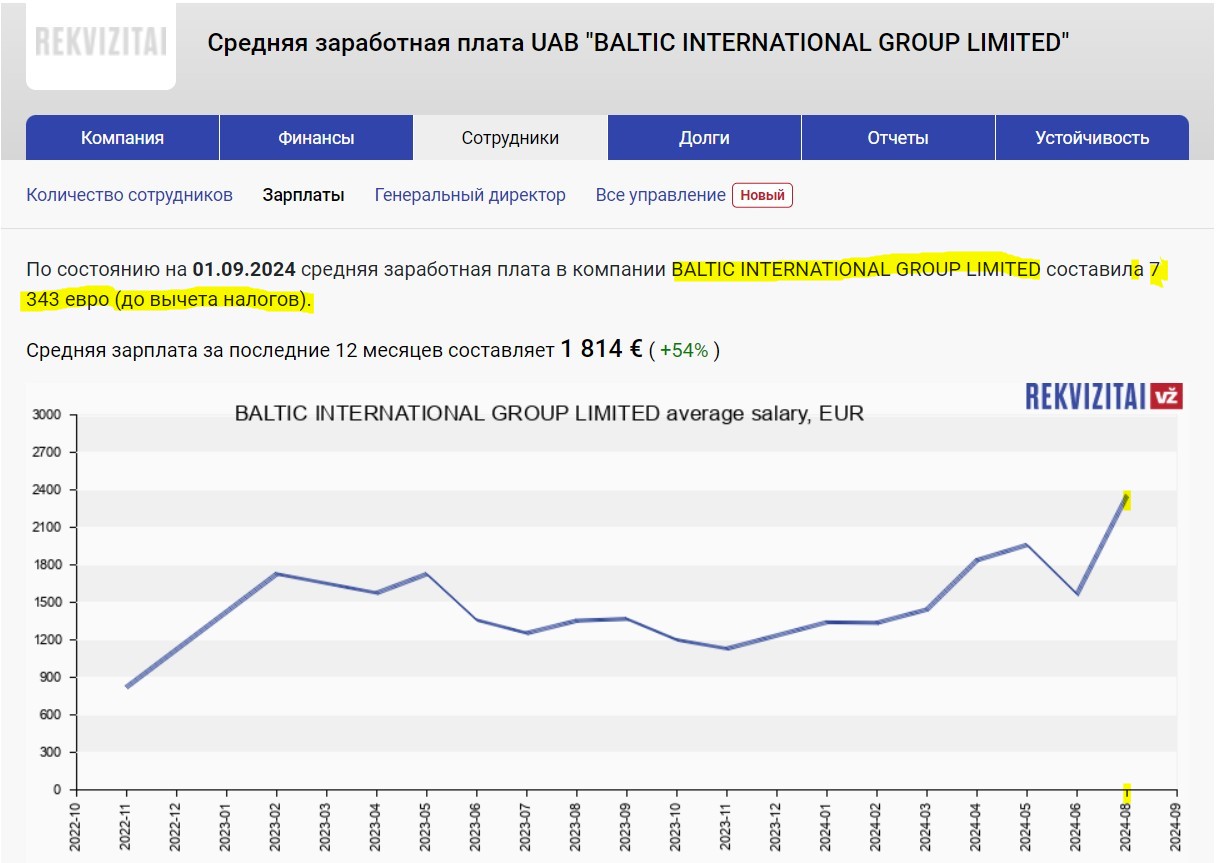 Средняя зарплата в компании „Baltic International Group Limited“ на 01.09.2024 года составляла 7343 евро (до вычета налогов)В феврале 2024 года в компании работало 36 человек, в мае осталось всего 12 работников. А 3 июля Вильнюсский суд принял дело о банкротстве комании. На 18 сентября 2024 года сотрудников не осталось. Возможно, не выдержала конкуренции с крупными фирмами или из-за долгов.