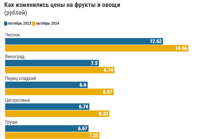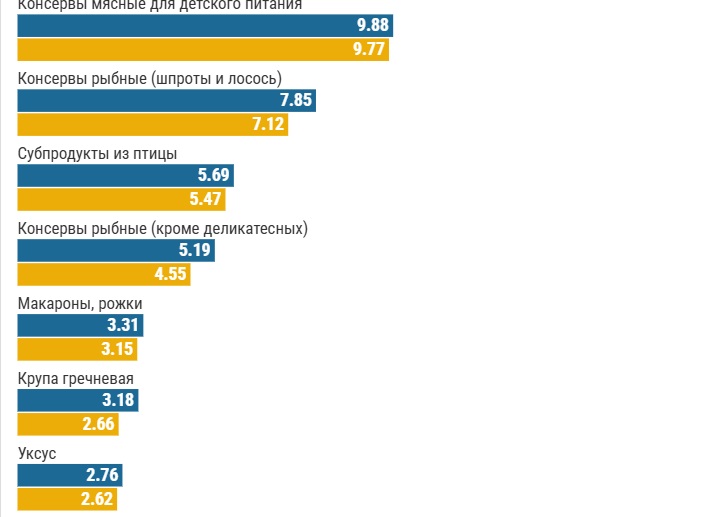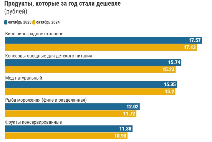 Впрочем, есть случаи, когда в октябре 2024 года некоторые продукты стоили дешевле, чем годом ранее. Прежде всего, это гречка (на 16%) и рыбные консервы (9-12% в зависимости от вида). Также стали доступнее консервы для детского питания: мясные — на 1,1%, а овощные и фруктовые — на 3,2%.