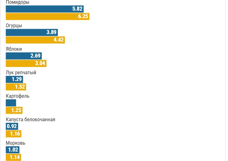 Из овощей и фруктов выделяется перец: его стоимость выросла на 31%. Более чем на четверть подорожала белокочанная капуста, почти на столько же — свекла. А вот огурцы и помидоры за год стали дороже на 13,6% и 7,4% соответственно.