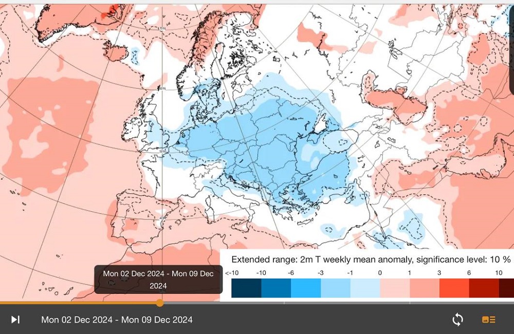 «Мы с ECMWF думаем, что зимний режим погоды скорее всего установится в нашем регионе со 2 декабря. Как можно видеть (карта на заглавном фото), температура воздуха в период 2–9 декабря прогнозируется ниже нормы на 1–3°. В Беларуси будут дневные отрицательные температуры, а ночью морозец около -8..-10°. Насчёт снега я не уверен. А до этого будет сплошная слякоть и температурные качели», — сообщает nadvorie.