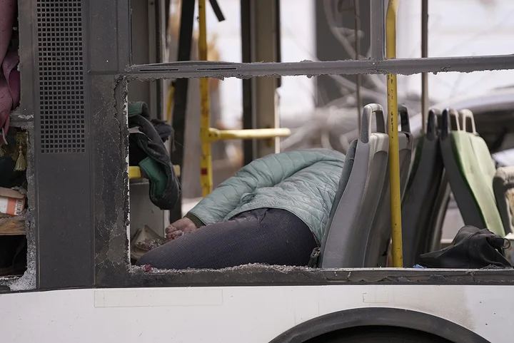 Тело убитого местного жителя лежит в автобусе после ракетного удара, Украина, 13 апреля 2025 года. Фото AP. Scanpix. LETA