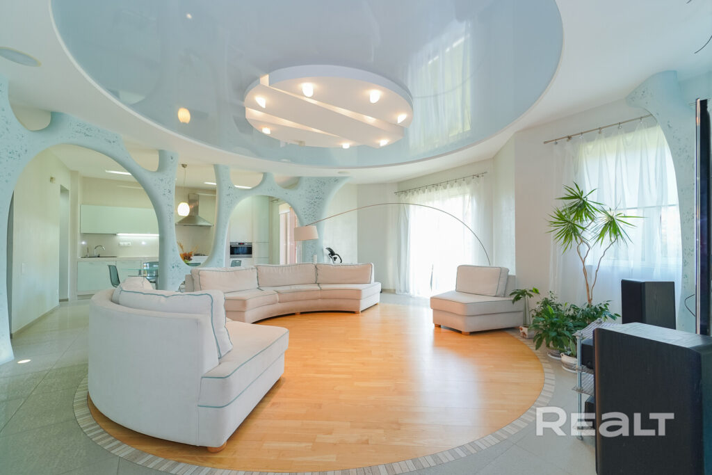 Трёхэтажный дом, построенный в 2010 году, поделен на четыре квартиры. И та, о которой пойдёт речь, занимает первый этаж. Общая площадь – 111 квадратных метров. Внутри: просторная кухня, круглая гостиная, спальня с гардеробной, детская, кладовка и два санузла. Отдельный бонус – два входа.