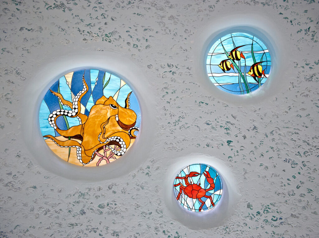 Но главное – это не метры, а атмосфера. Интерьер создал белорусский архитектор Роман Гогошин. Проект называется «В стиле морской волны». И это не просто красивая метафора: почти всё пространство отсылает к подводному миру. Волнообразные перегородки, органичные формы, стеклянные поверхности, витражи с морскими обитателями, мебель округлой формы, мягкие тона и свет, будто бы преломлённый сквозь воду.