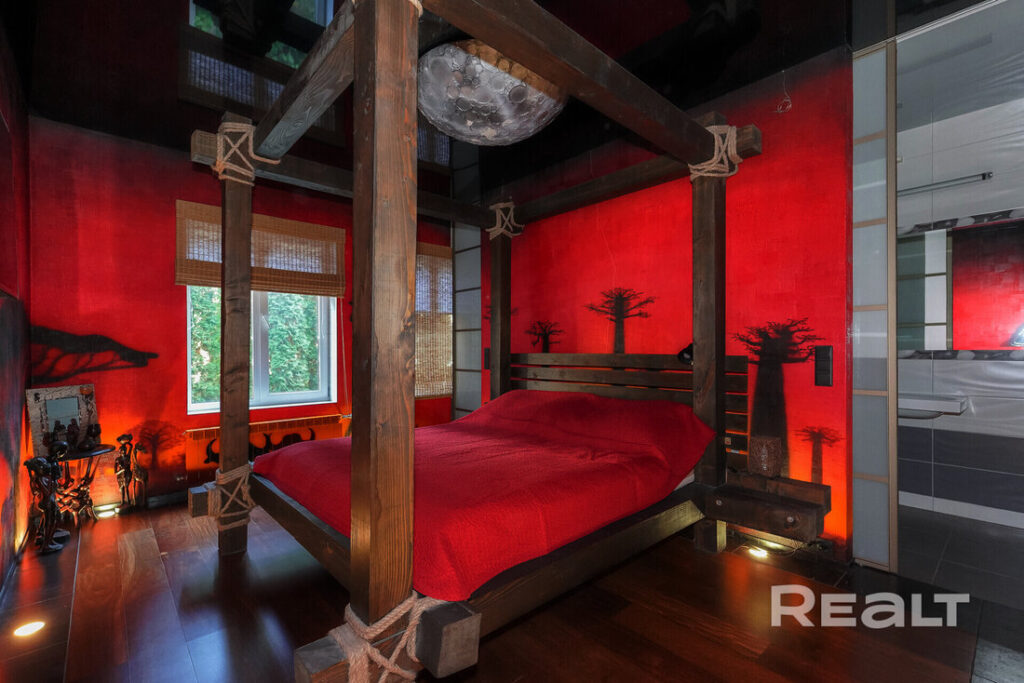 А вот хозяйская спальня – противоположность всему вышеописанному. Добро пожаловать в Африку. Красно-чёрная палитра, массивная кровать с канатами и балками, декоративные баобабы на стенах и тёплый свет – эта комната будто выпрыгнула из кинематографической фантазии.
