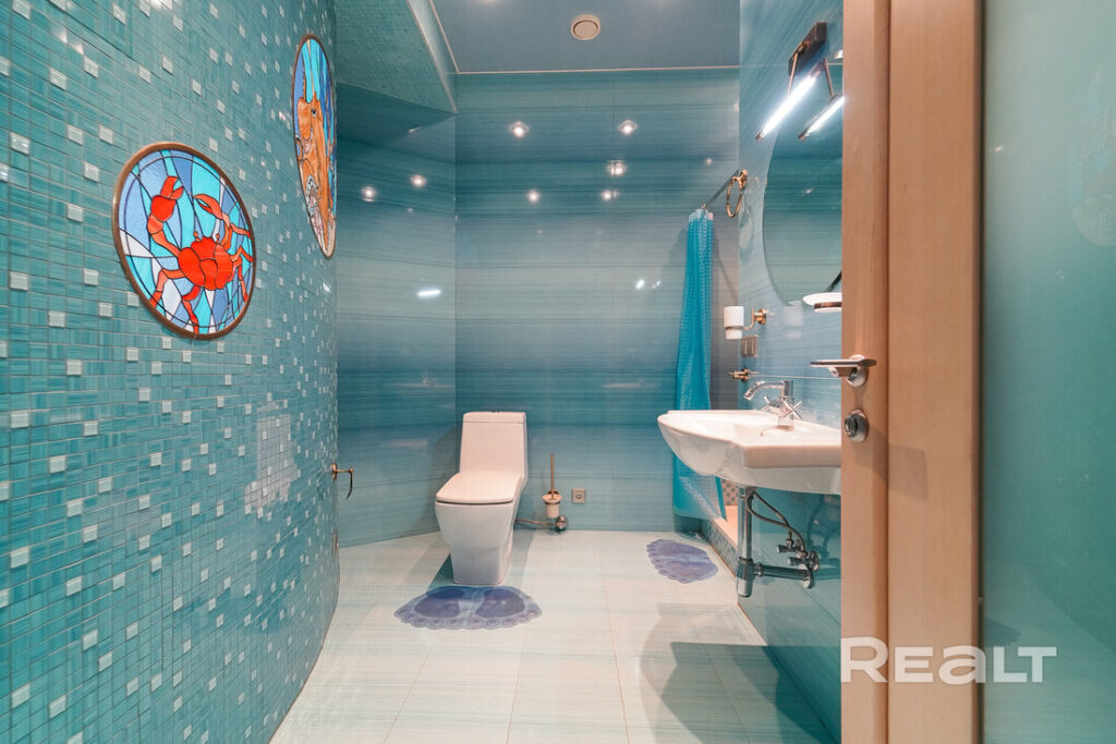 В детской – снова вода: стены оформлены фотопанорамой с дельфинами и океанскими волнами. Санузлы выдержаны в той же морской гамме: витражи, мозаика, бирюза.