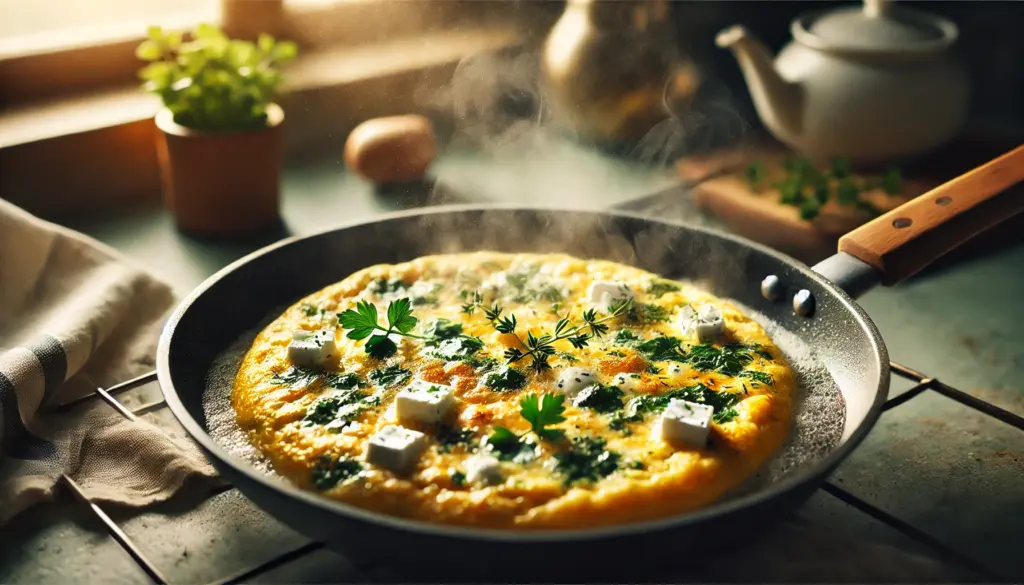 - Сначала –омлет. В миске взбей яйца с щепоткой соли. Добавь измельчённую зелень и раскрошенную фету – прямо руками, не бойся, это придаст текстуру. На сковороде разогрей немного масла и вылей яичную смесь. Жарь на слабом огне – пусть схватывается медленно, оставаясь нежным и сочным.