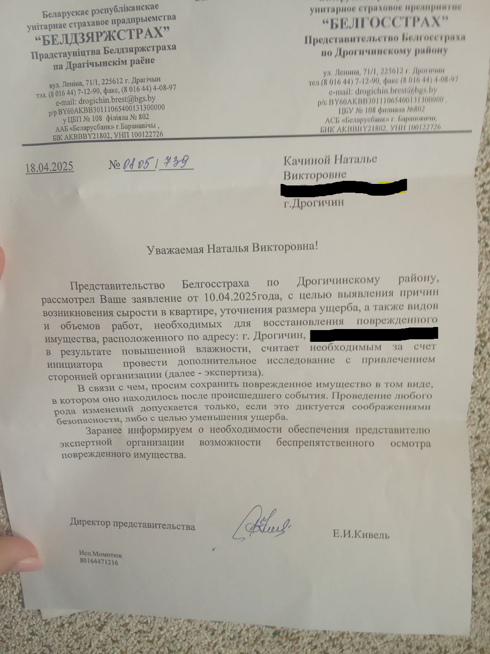 В расстройстве от того, в какую сумму выльется замена ламината в зале, кухне спальне, отделка стен во всех комнатах, ремонт мебели – что подтверждено дефектным актом комиссии ЖКХ, чтобы возместить ущерб, Наталья направила заявление в представительство «Белгосстраха» по Дрогичинскому району.